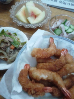 エビフライ、野菜炒め、烏賊の酢の物、桃ちゃん。。